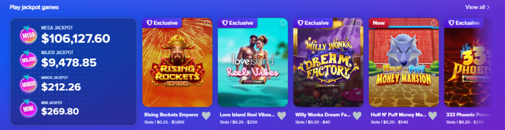 • Giochi popolari: Huff NPuff Series, Big Bass Bonanza, jackpot progressivi